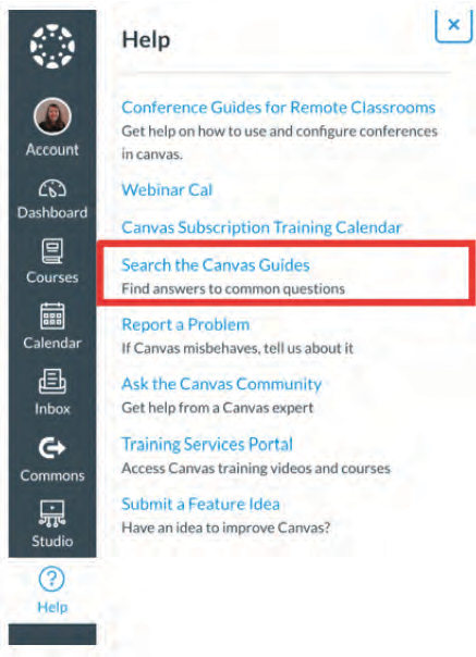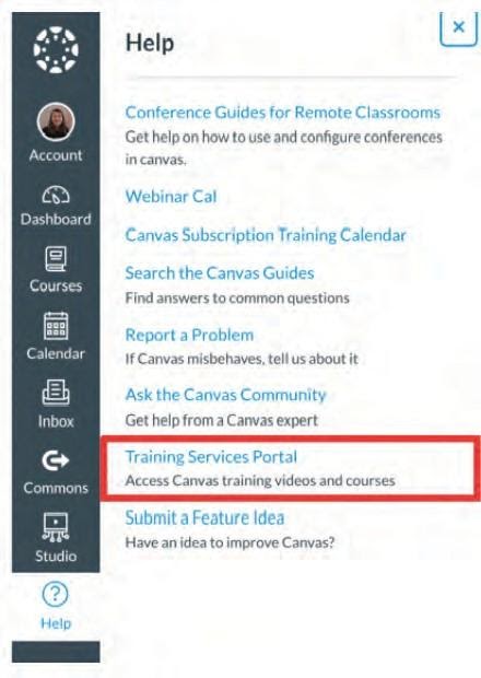• Go to the  Canvas Dashboard and click on the “Help” button to access a range of helpful resources and The Training Services Portal.